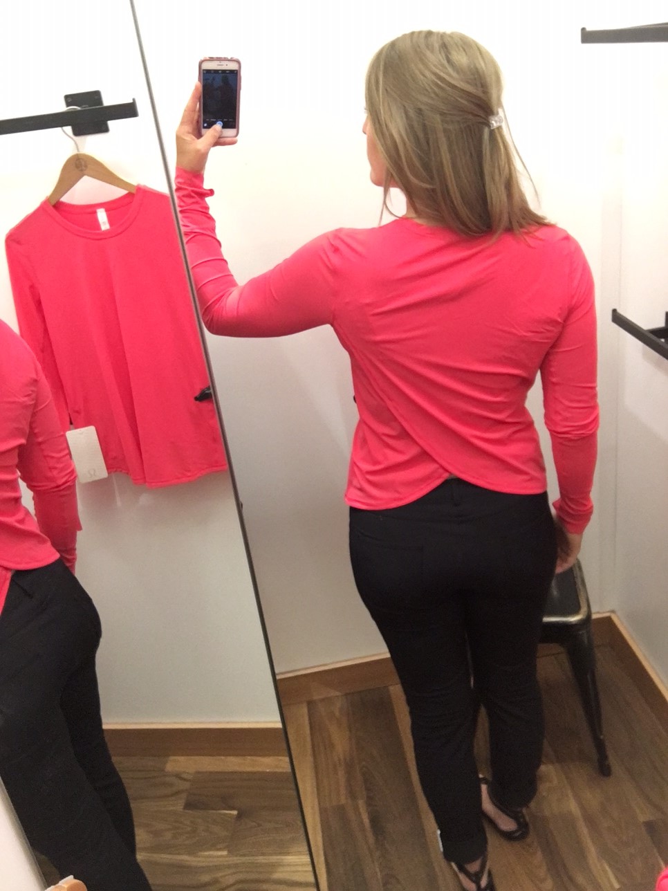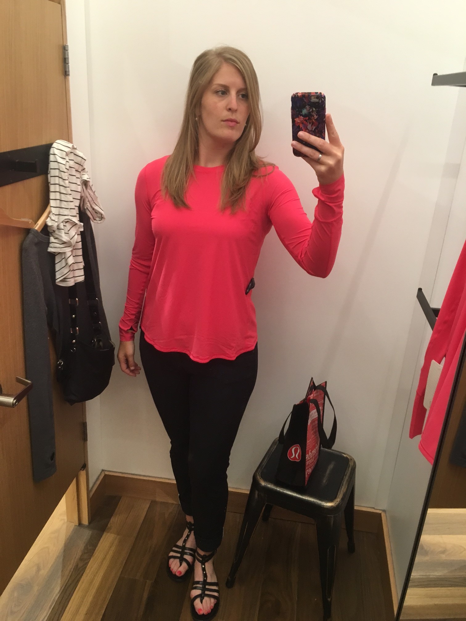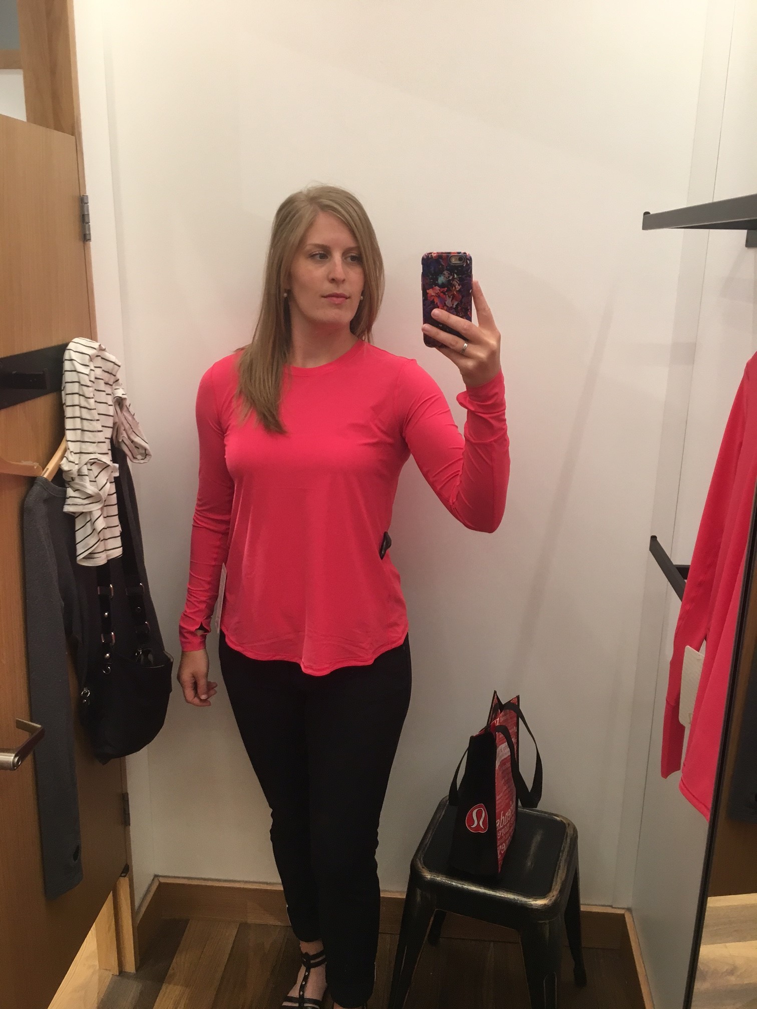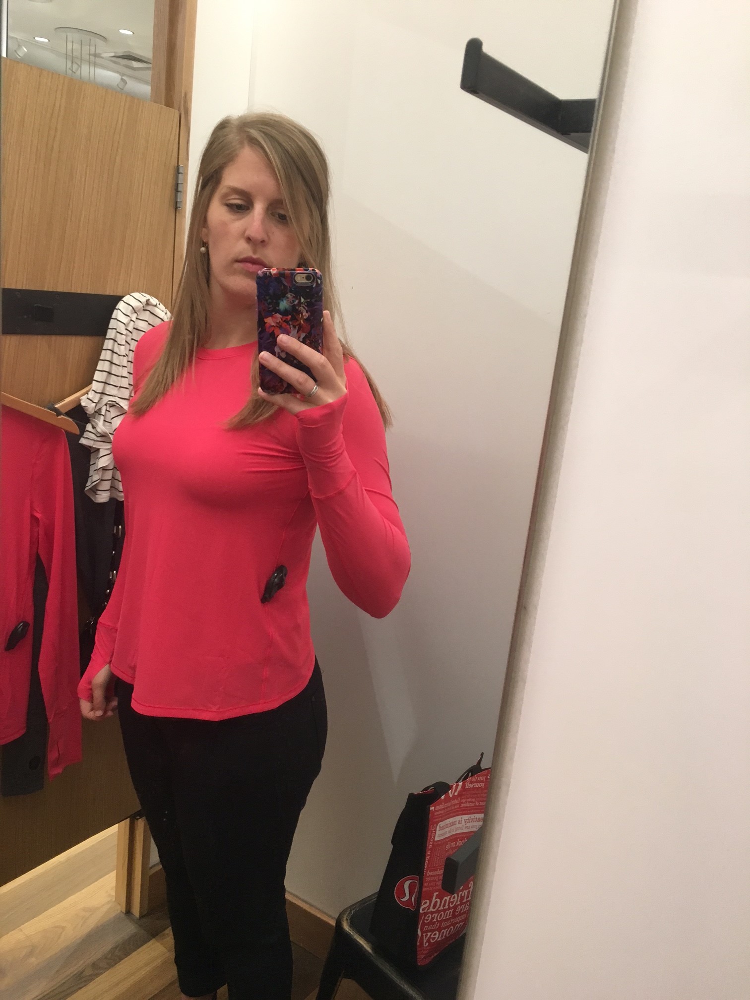 So, out the door I went with 2 second thoughts in a signature red lulu shopper in hand. Return 2, buy 1. Still will end up -1 shirt. Math is great.