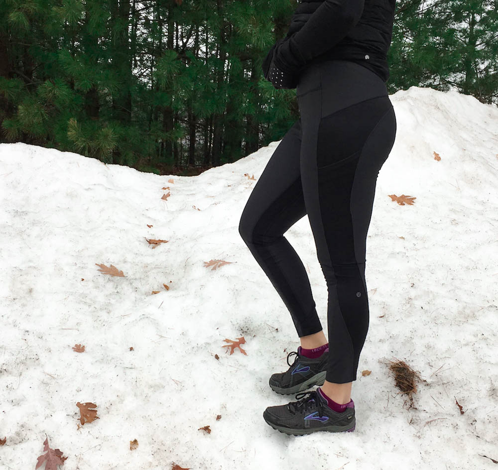 The Sleet Sprinter Tight is meant for workout warriors who won’t let a little freezing rain get in their way. The lighter shade of black (the majority of the pant) is lulu’s softshell material, which is has some stretch yet is water resistant.