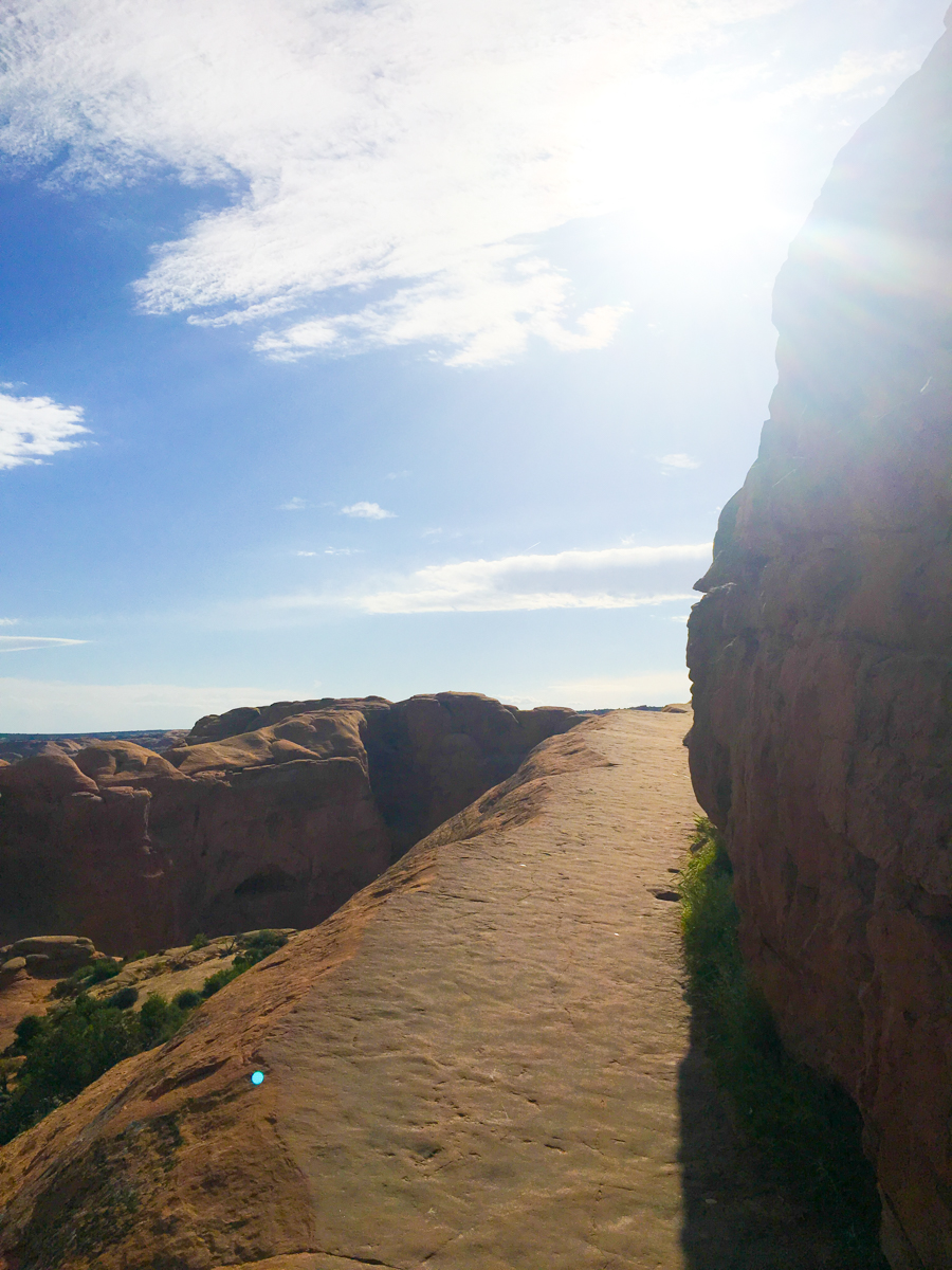 As the hike continues, you find yourself hiking along a ledge blasted into the side of a huge rock, and you start wondering where are both the safety rails for that big dropoff to your left, and where this f’ing arch is that everyone keeps talking about.