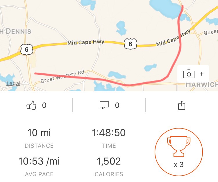Training doesn’t care if you’re at home or not, so off I went to the Cape Cod Rail Trail to bang out the long run for the week. It was supposed to be a ‘fast finish’ long run, with splits decreasing through the latter 7 miles of the run. I thought I was actually going to make a speedier progression happen, until I ran out of water and my legs started getting mad at me.