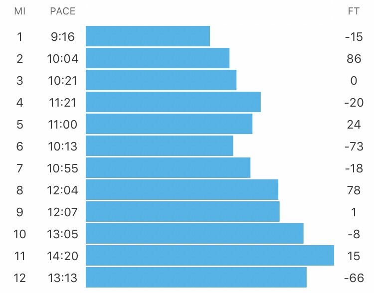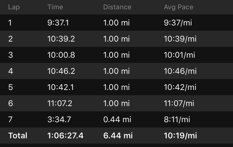 Legs felt good(ish) for the majority of the run, but I plain old overheated. My goal was no walk breaks after last week’s physical/mental/emotional breakdowns happening once a mile.