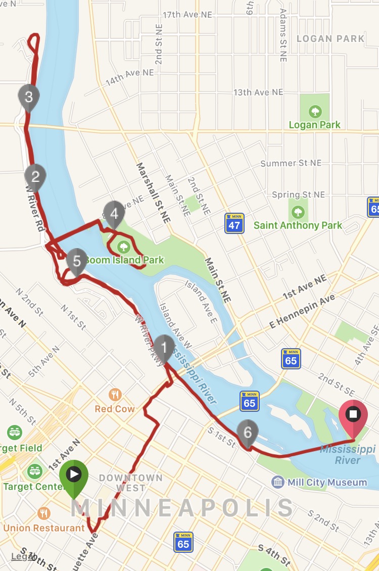 For the first 6.4 miles, I averaged a 10:19 pace (says Garmin, Strava thinks I was faster), which isn’t *that* horrible by my standards. This portion included a sprint across Stone Arch Bridge to finish out my run time in Minneapolis somewhat ‘ceremoniously’. Needed to catch my breath on a bench afterward before continuing the distance home.