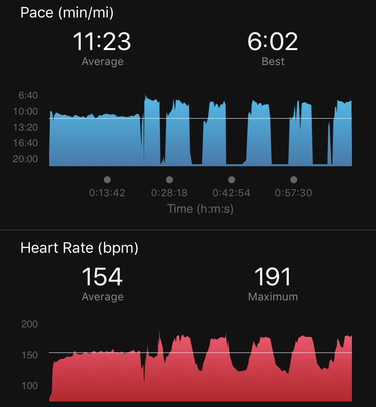 That said, warmup felt fine but the tempo miles got spicy fast. I did the first 2 miles unbroken and then had to walk for .05mi before starting each of the next three. So, the tempo miles really morphed into mile repeats.