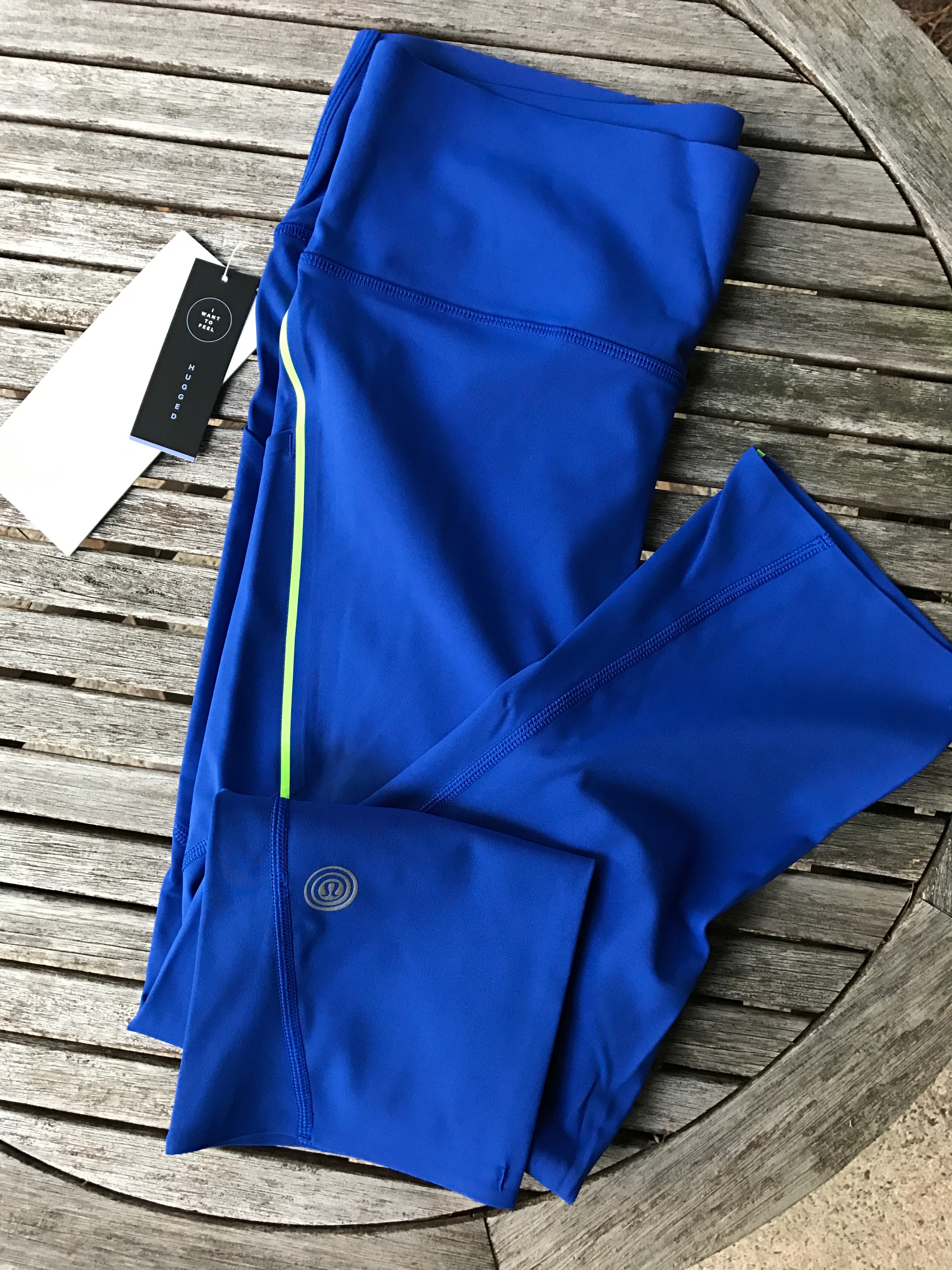 Pictured at left are the Speed Shorts, and at right are the jet stream blue Chase Me Crop, with a sweeeeet zippy green stripe down the side. Love.