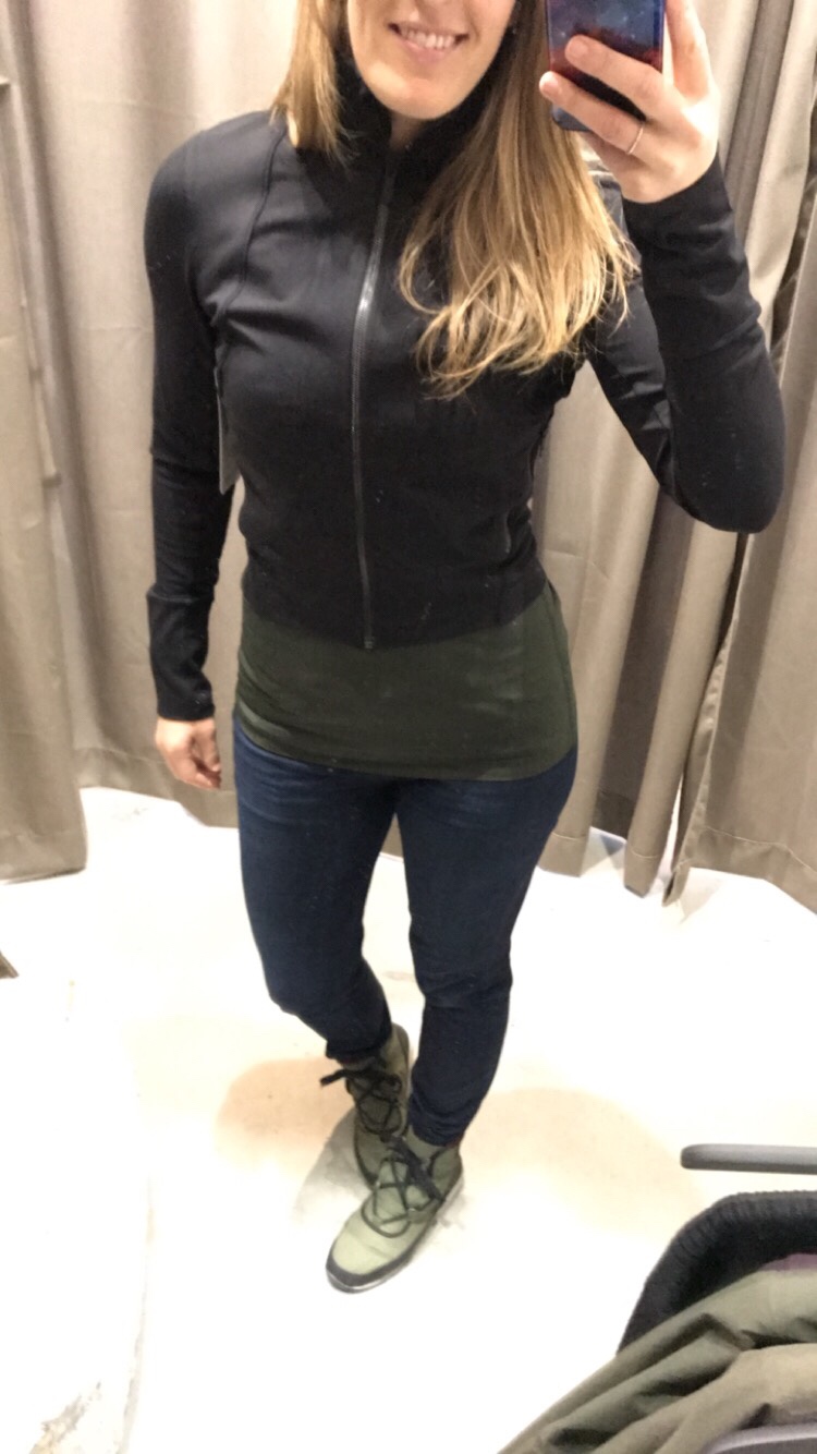 I didn’t read the tag, I just saw a high collar and grabbed it. As illustrated by the look on my face, I did not expect the crop. I’ve got a size 10 on here, which I tend to go for in jackets to accommodate my shoulders, despite going with my TTS 8 in many other lulu tops.