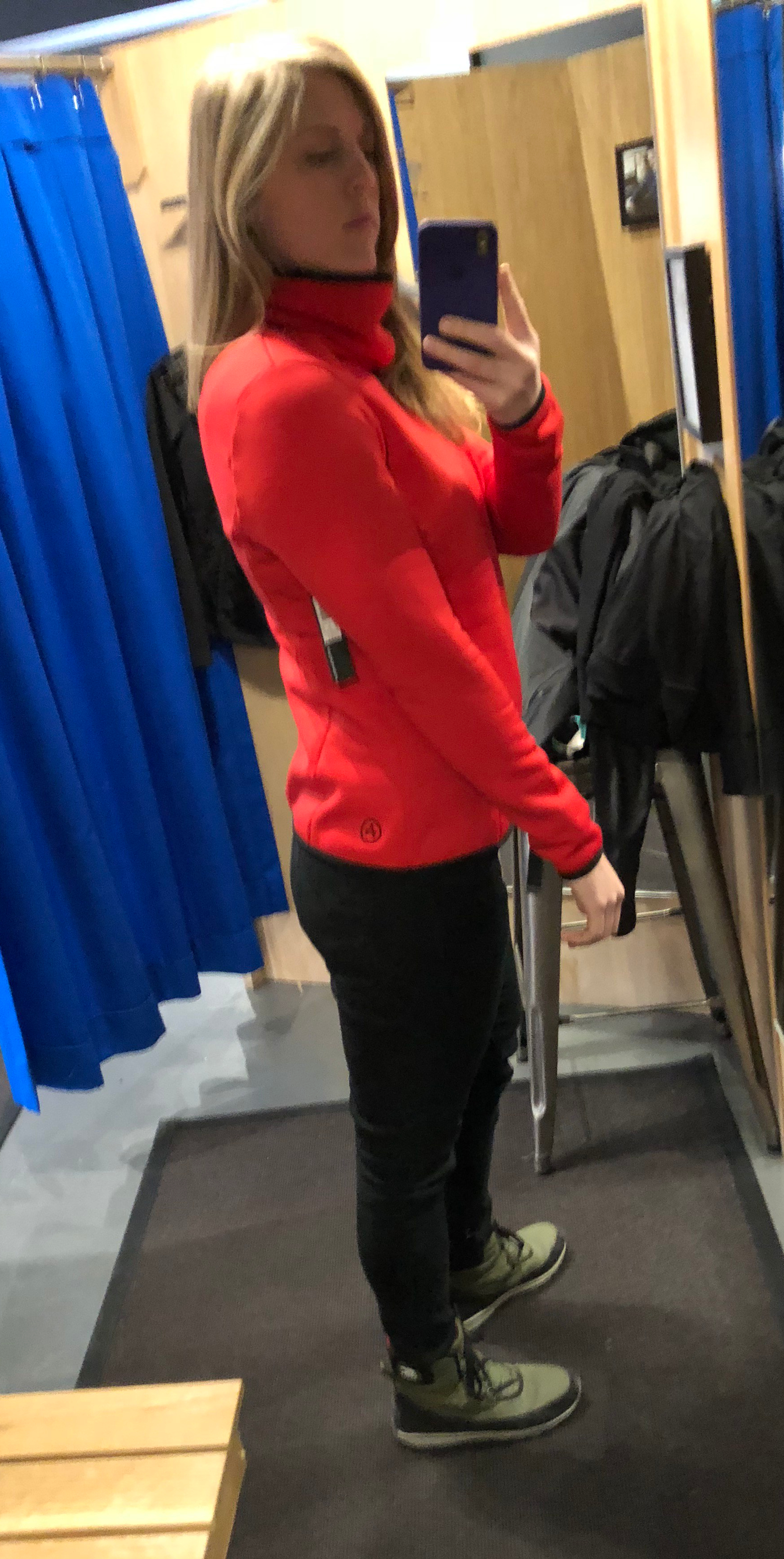 I went in search of the System Pullover, but apparently stores can’t keep enough of them in stock. The Aspen store was sadly out, but I still poked around and tried a couple things on: namely, the Noir Full Zip Fleece and the Polartec Cowl Pullover.