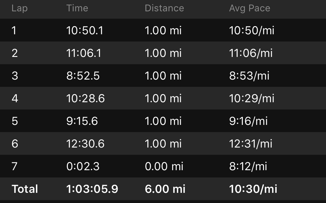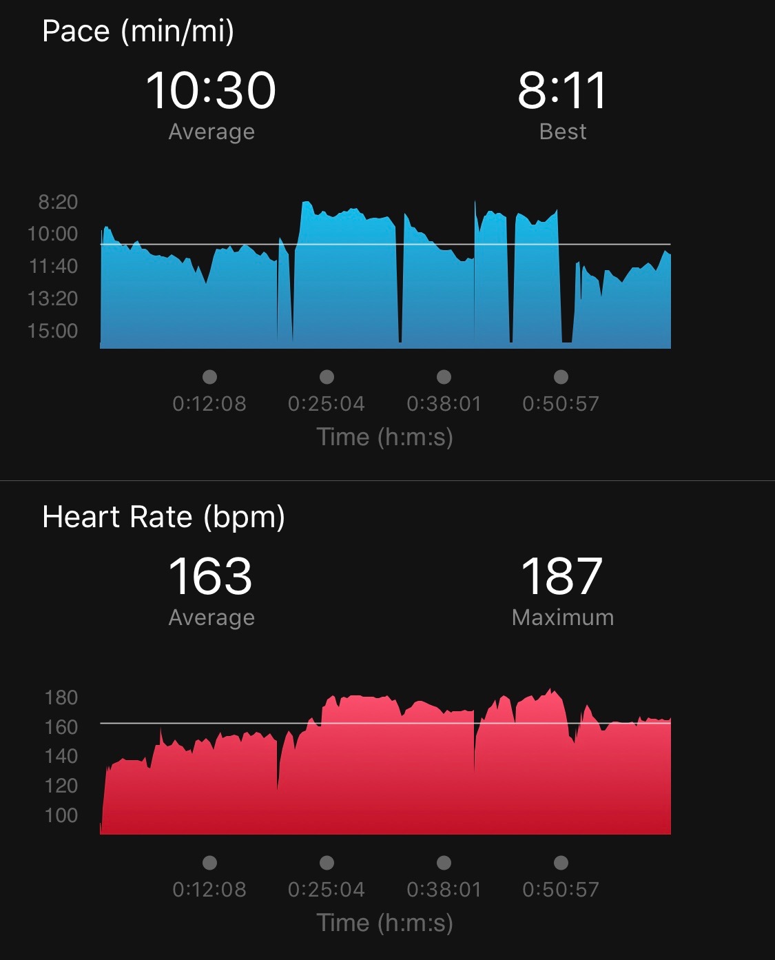 It felt creaky and rough. It was a warm one out, so I did have to slow to a fast walk if my HR got as high as 155 and wouldn’t go down with a few deep breaths.