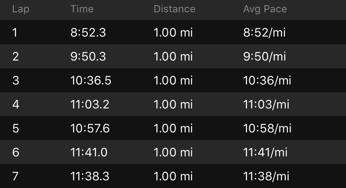 Monday I managed to scrap together 7.5 miles before it got too close to Wednesday’s race. The miles went fairly well, given that it was a toasty one outside. Okay so maybe looking back on my splits the first couple of miles went well… then fizzle time. Heh.