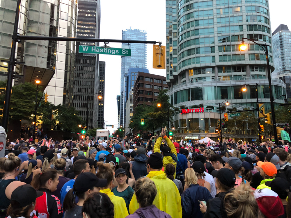The race start was actually held off by 15 minutes, because the backup at bag check was so significant. We made it outside, got the pre-race nervous pee out of the way (no wait between Hastings & Cordova, I’m telling you!), and headed off to the corrals around 6:52.