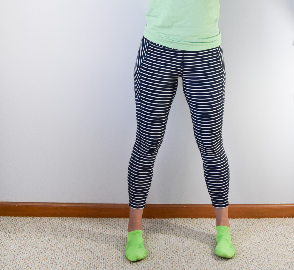 The stripe contenders are admittedly a little snug, but that also means they stay put during workouts. Full length lulu tights ALWAYS fall down on me because the legs aren’t tight enough compared to the hips/midsection.