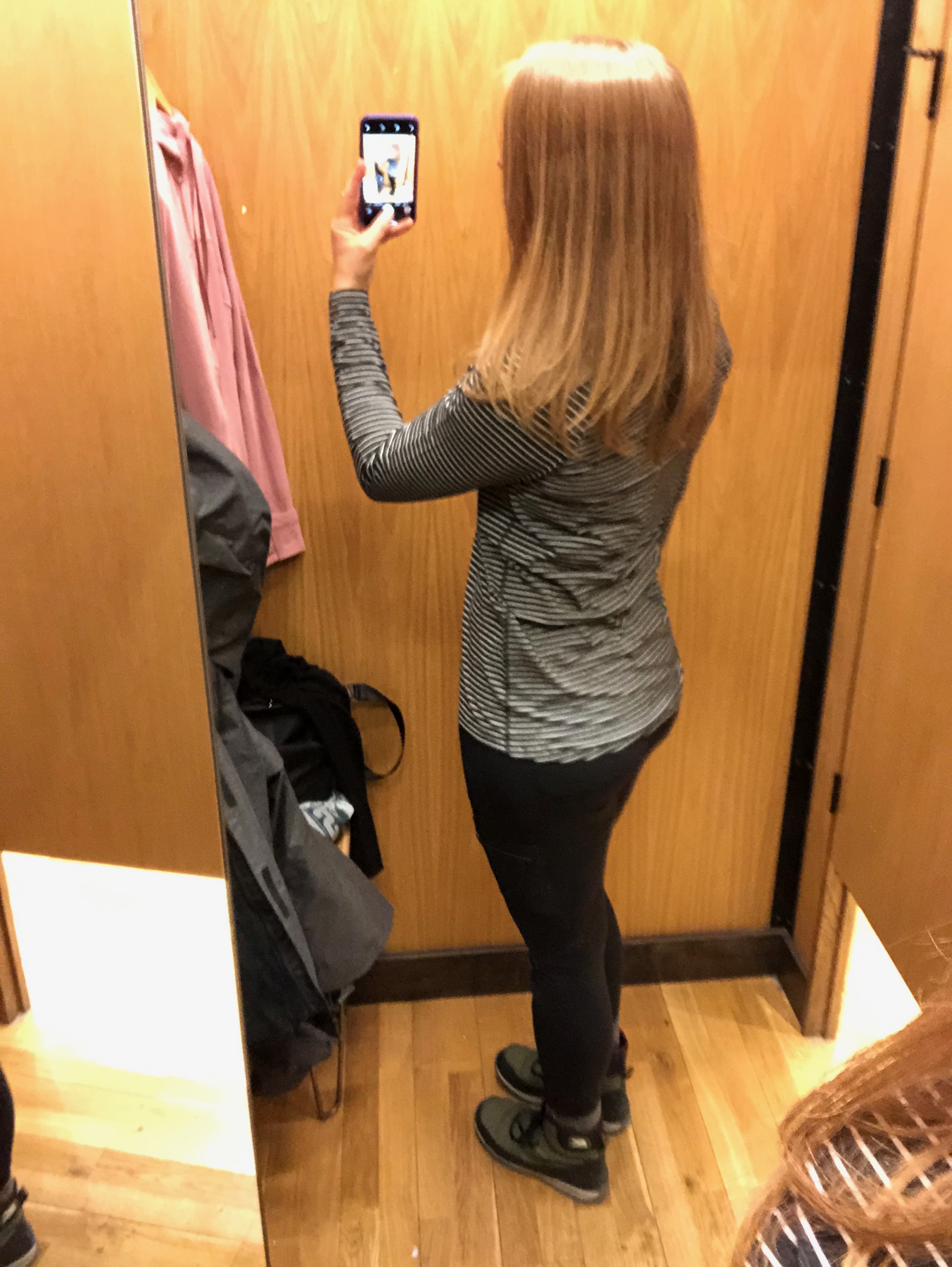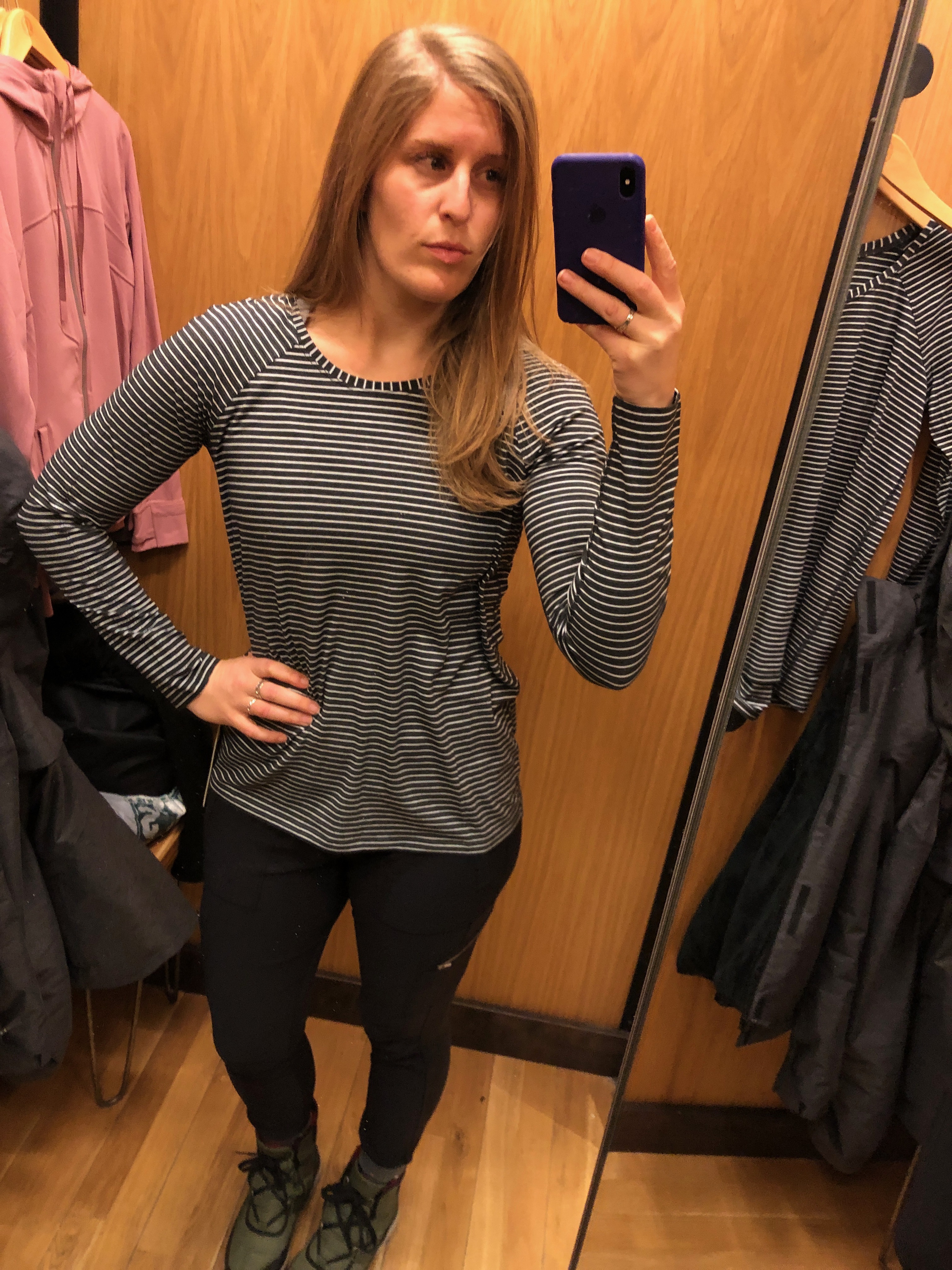 It looked big, so not only did I try on my usual 8, I even tried the 6 too. I want to love the stripes and the baseball style, but there are these weird seams down the sleeves that I just can’t get down with. First, the 8…