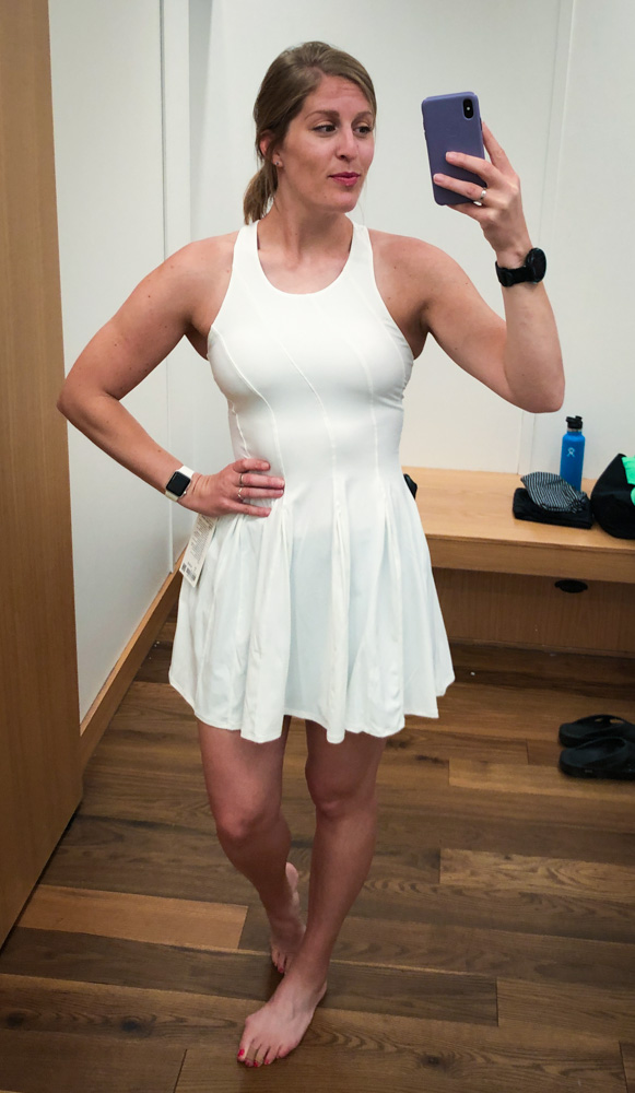 So it’s not a tennis dress, per se… it’s a run dress. Available online only, I was surprised to see not one, but two on the rack that would actually fit me. The black is an 8, and the white is a 10. Given that my top half and bottom half are two different sizes, I’m not sure which would qualify as “true” to size.