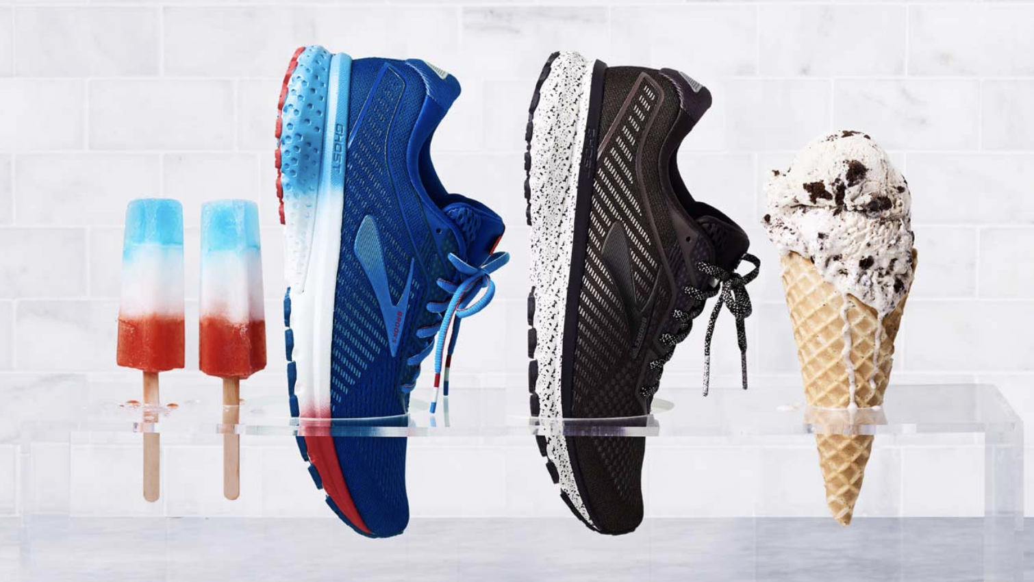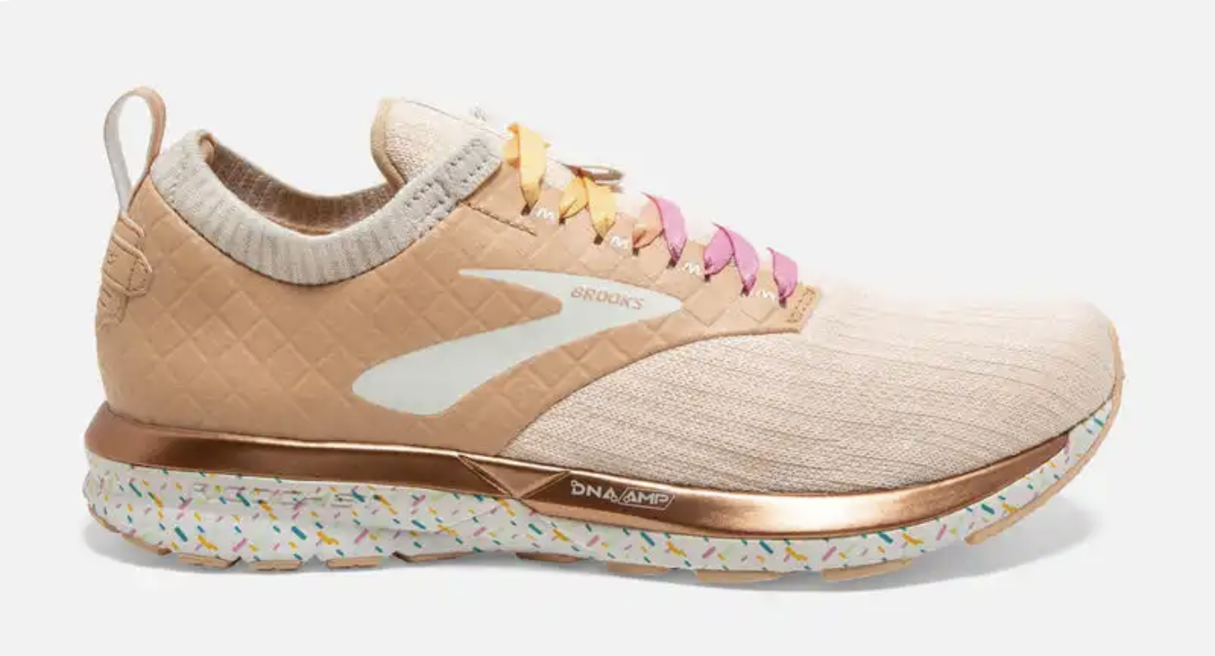 Women can choose from the Ghost 12 or the Ricochet. The collection features two models inspired by vanilla ice cream with rainbow sprinkles, which share the same rainbow sprinkle soles and rainbow gradient laces. The Ghost 12 is a more even off-white color with the fun sole, while the Ricochet features a bronze trim and tan detailing that looks like a waffle cone.
