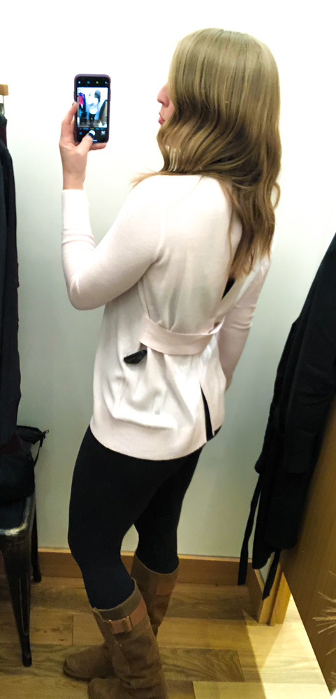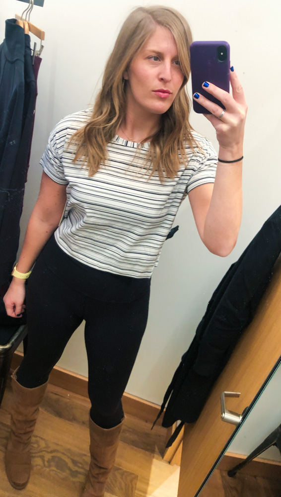 The fabric is a ribbed knit, making them more substantial than last year’s cargo-pocketed flop. I admittedly went directly from going HAM on brunch to the mall, so I was totally feeling the food baby. Due to that I didn’t feel my most confident in Cassis. However, someone already bought out the black 10 in my store, so I had no choice.
